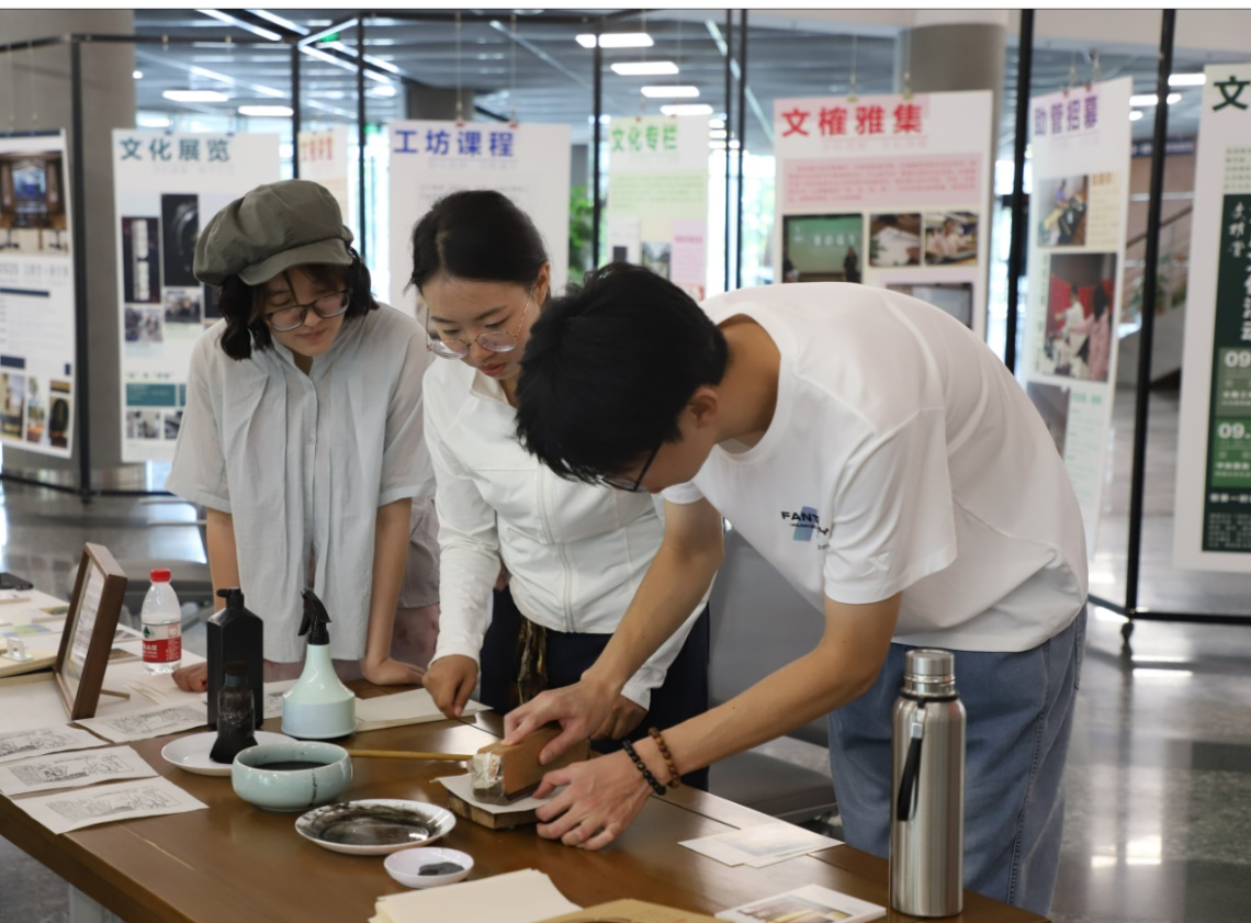 “文化长廊”区域,文化展览、工坊课程、文榷讲堂与文榷月历等集中呈现,展示了图书馆的文化育人理念与丰富资源。“文化长廊”目前仍在嘉定校区图书馆一楼展出。“文榷工坊”成为体验实践的热门打卡点。师生可亲身体验木版水印、金石钤印等传统技艺,刷印一幅同济校园主题木版画,盖一枚图书馆建筑专属印章,让文化在指尖“活”起来。现场还陈列了历年师生在文榷工坊创作的精品,展现了浓厚的文化传承氛围。体验打卡的同学可兑换限定款“四济物语·校园廿四节气植物图谱月历”,将校园时序与传统文化智慧融入日常学习生活。