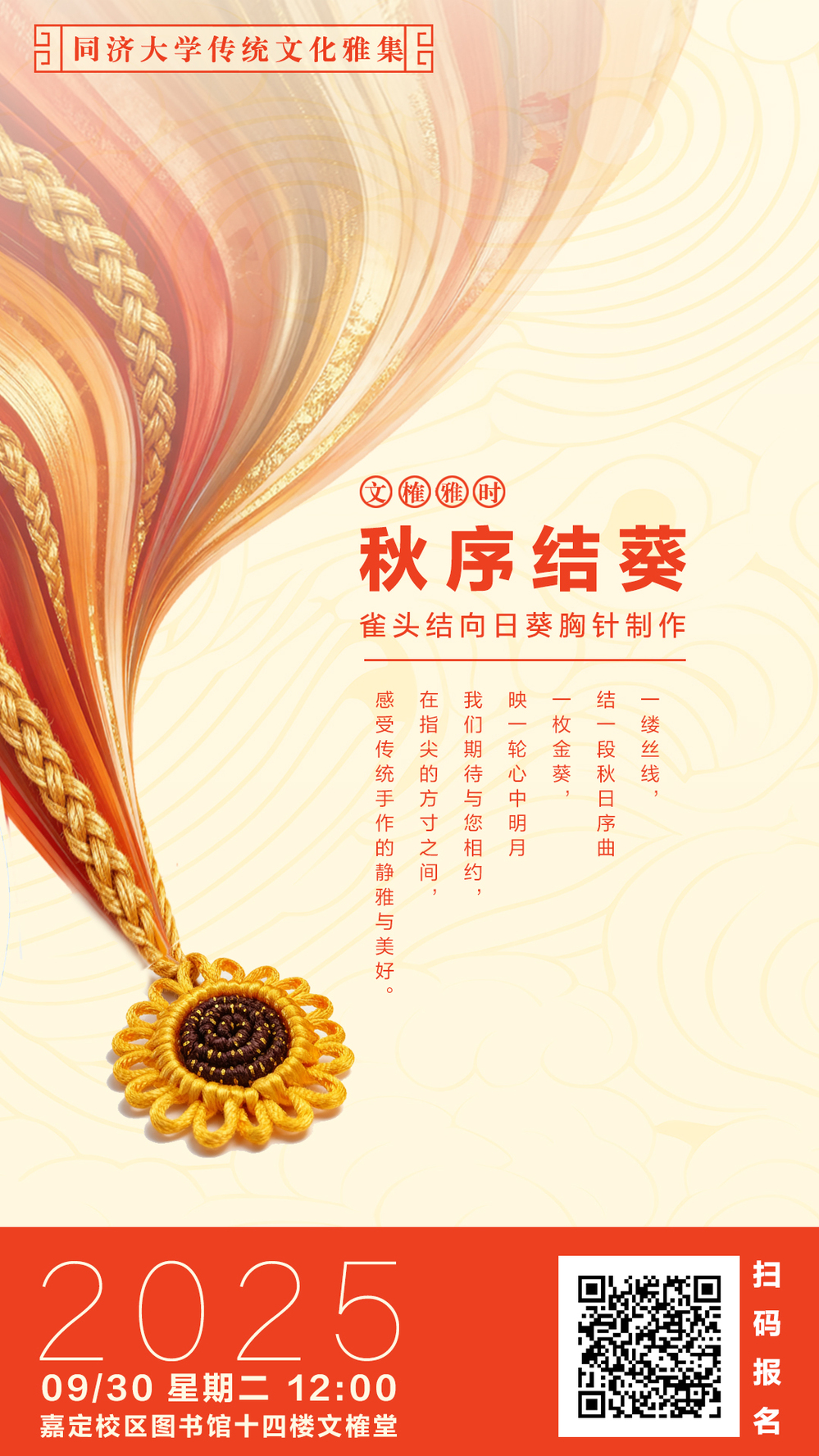 雀头结,其形如雀鸟轻点,承载着“心情雀跃”的美好寓意。本次活动将以这古老的绳结为语言,带领您从基础技法开始,亲手盘绕、抽线、成形,最终完成一枚独一无二的向日葵胸针。向日葵始终向阳,恰如人对团圆与光明的向往,让这份手作的温度,伴您度过一个充满心意与创意的中秋。