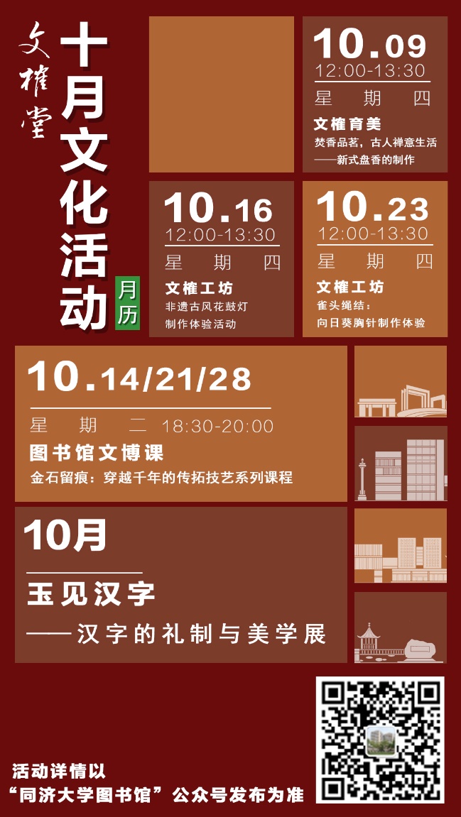 在享受美好假期的同时,不妨也为节后的校园生活预存一份期待。文榷堂精心筹备的十月文化活动,将在假期后回归,以书香雅韵伴你从假期的松弛从容过渡到学业的充实有序。文榷堂已准备好一系列精心策划的文化活动,迎接您回归校园,愿书香、墨韵与巧思,点亮您的十月时光。快来看看10月有哪些精彩活动吧——