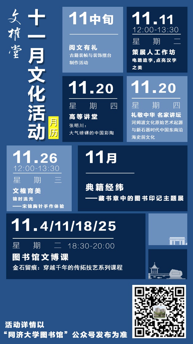 金秋未尽,丹桂满园,书香依旧,嘉定校区图书馆文化之旅仍在继续。十一月,我们以更丰富的内容、更深厚的内涵,邀您一同走进历史深处,触摸文明脉络,在动手与思考中,感受中华优秀传统文化的魅力。一起来看看11月的精彩活动吧——