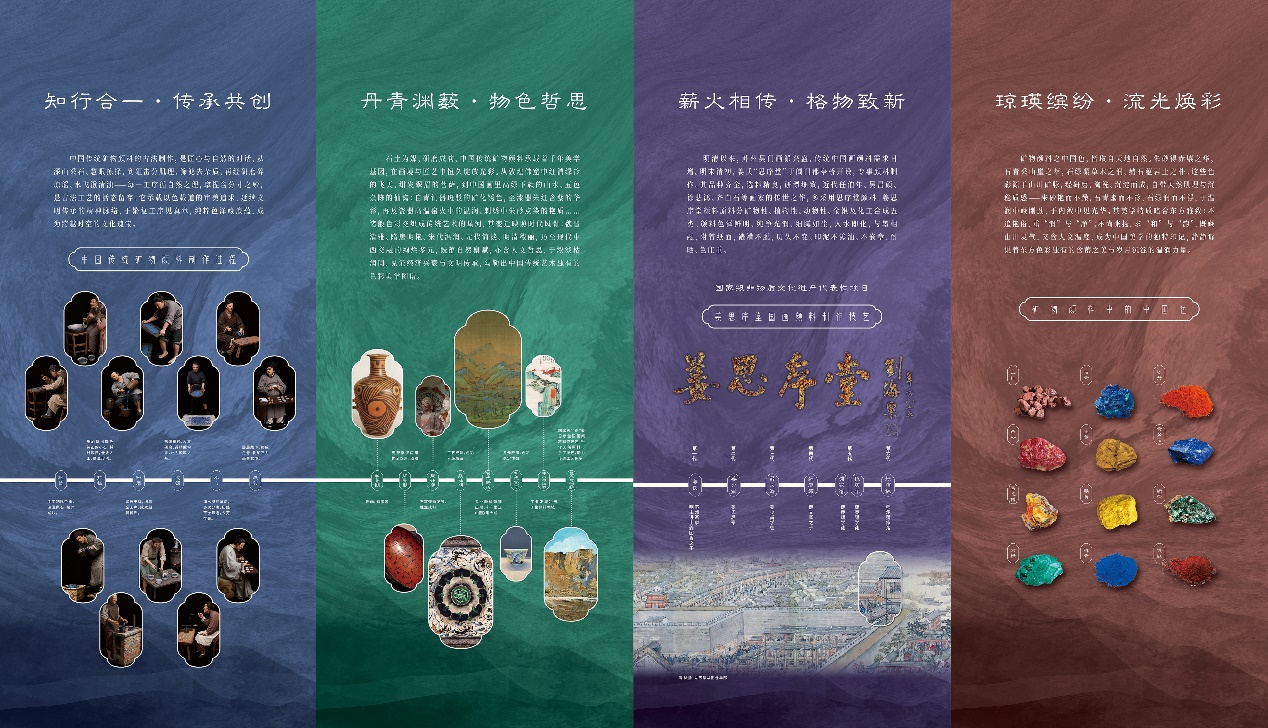 本次展览设有“丹青渊薮,物色哲思”、“薪火相传,格物致新”、“琼瑛缤纷,流光焕彩”与“知行合一,传承共创”四大篇章,让我们触摸大地书写的色彩史诗,感受古人对自然的敬畏与探索,领略传统工艺与天地造化的奇妙交融。