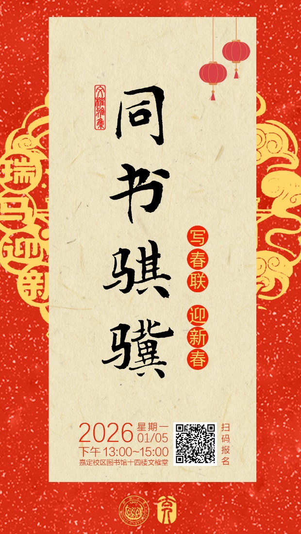 岁序更替,华章日新。2026年总台春晚以“骐骥驰骋”为题,描绘出奋进向上的时代气象。值此新春将至,为传承中华优秀传统文化,营造喜庆祥和的校园节日氛围,图书馆联合工会,邀请同济大学中国书画协会的老师和嘉定校区的师生欢聚文榷堂提笔挥春,以笔墨寄情,以联句言志,共同书写属于同济人的新春序章。