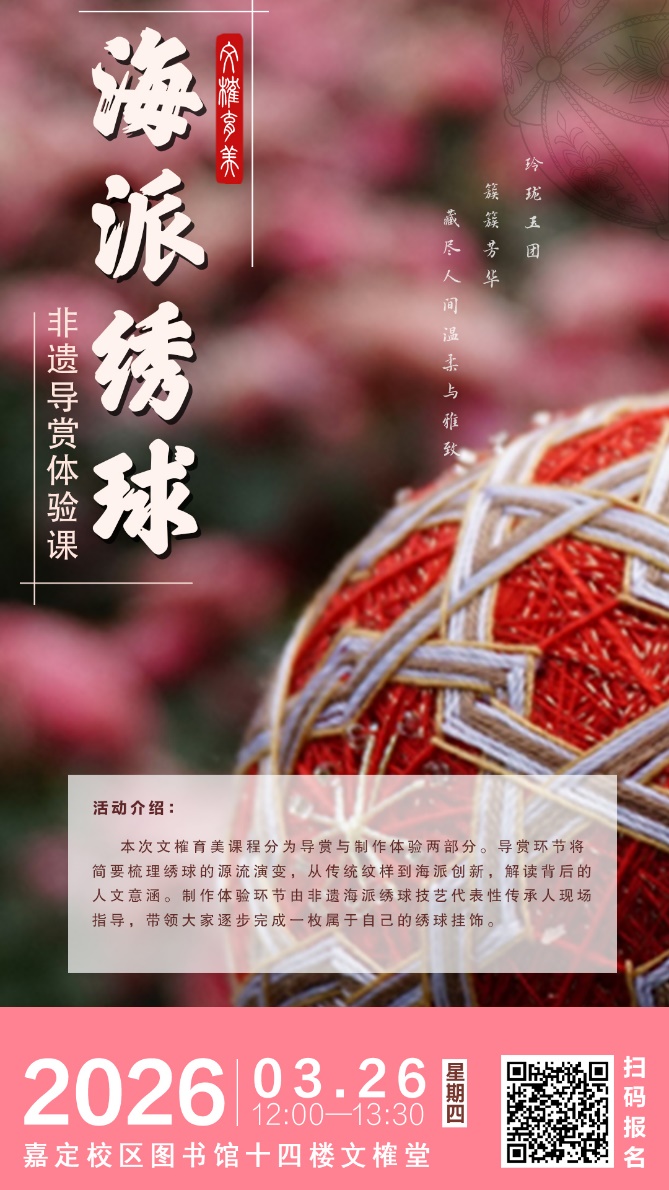 本次文榷育美课程分为导赏与制作体验两部分。导赏环节将简要梳理绣球的源流演变,从传统纹样到海派创新,解读背后的人文意涵。制作体验环节由非遗海派绣球技艺代表性传承人现场指导,带领大家逐步完成一枚属于自己的绣球挂饰。