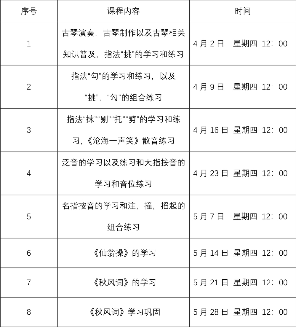 本课程为连续性入门课程,完整参与方能初步掌握古琴基础技艺与文化内涵。我们期待每一位报名的同学,都能在七弦之间,遇见沉静的自己,收获一段难忘的千年琴韵之旅~