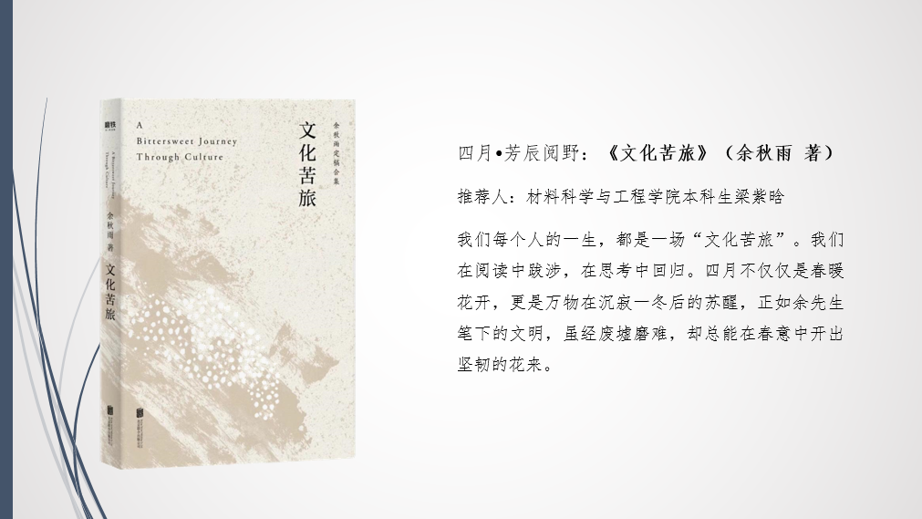 高三那年,我向往书中描绘的每一处风景,那是支撑我走过枯燥生活的动力;而如今再次翻开它,我才发现,其实我们每个人的一生,都是一场“文化苦旅”。我们在阅读中跋涉,在思考中回归。四月不仅仅是春暖花开,更是万物在沉寂一冬后的苏醒,正如余先生笔下的文明,虽经废墟磨难,却总能在春意中开出坚韧的花来。