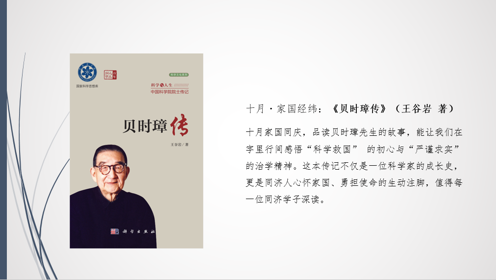 十月家国同庆,品读贝时璋先生的故事,能让我们在字里行间感悟“科学救国” 的初心与“严谨求实”的治学精神。这本传记不仅是一位科学家的成长史,更是同济人心怀家国、勇担使命的生动注脚,值得每一位同济学子深读。